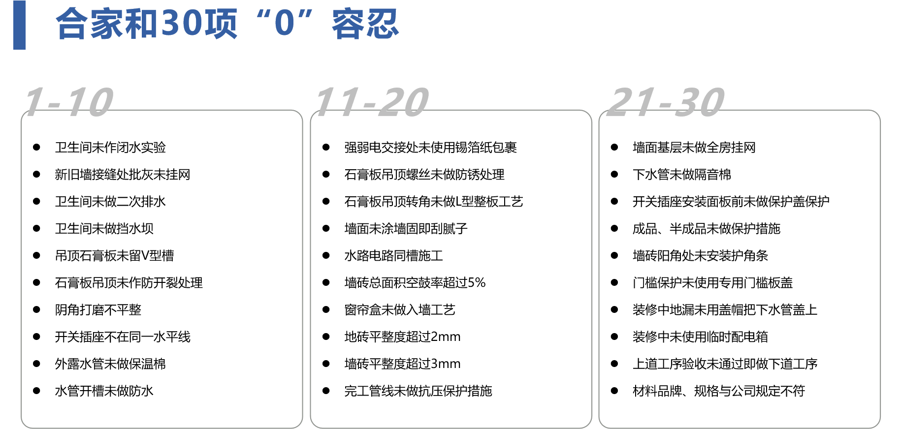 合家和深知,施工品质是装修公司的立身之本。只有精湛工艺与严格标准,才能打造经得起时间考验的品质空间,也才能通过市场与业主的双向检验。为此,合家和建立 5 大工种施工标准、126 项施工节点,层层严格把关 —— 不仅有效提升施工效率,更能杜绝安全隐患,确保每一项工程品质完美落地。若出现工程质量问题、验收不合格,业主可对任何不合格工程说 “不”,合家和将直接砸掉重新装,所有费用由公司承担。